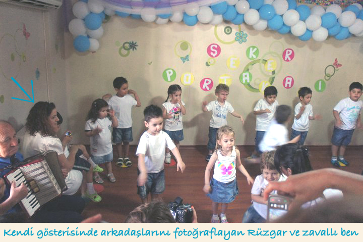 Bu arada bencillik gibi olacak ama belirtmem lazım, şükürler olsun bu çileyi tek başıma çekmedim. Rüzgar’ın patlamasından kısa bir süre sonra, arkadaşımın kızı Elif de aynı aşamaya geçti. Biz iki anne, bit kadar sandalyelerin üzerinde çocuklarımızın gösteriyi daha fazla rezil etmemesi için elimizden geleni yaparken bayağı bir ter döktük. Pazartesi günü okulda karşılaştığımızda “Bi gün o sandalyeler bi tarafıma kaçıcak diye korkuyorum” dedim, o da “Bana kaçmadıysa sana hiç kaçmaz” diye yanıtladı 😀