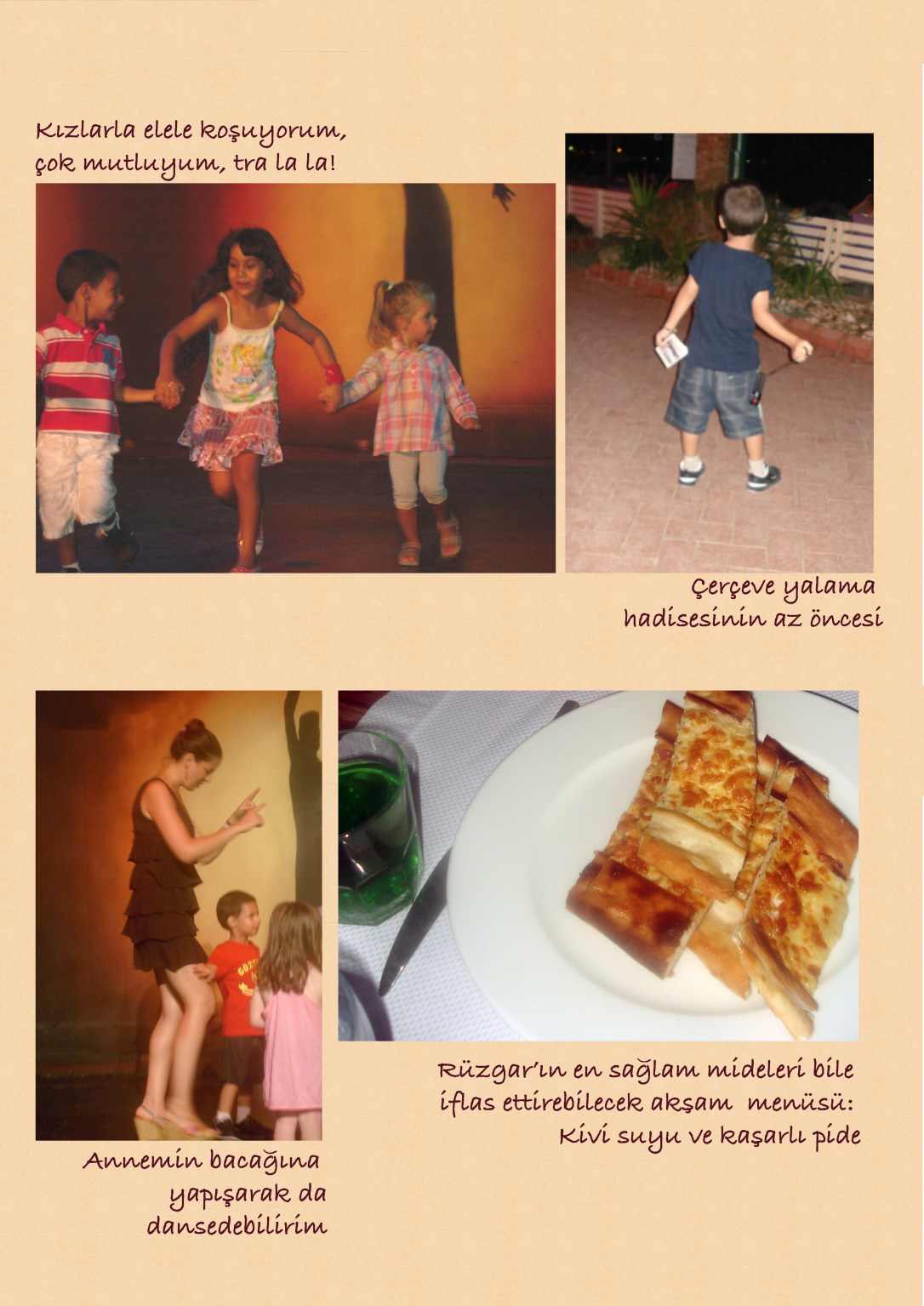 • Bitez’de yemek yediğimiz restorandaki garson: “Pek akıllı bir çocuk maşallah, zehir gibi” nitelemenizin akabininde, Rüzgar’ın günün menüsünün yazıldığı tahtanın çerçevesini yaladığına şahit olarak yaşadığınız hayalkırıklığı için