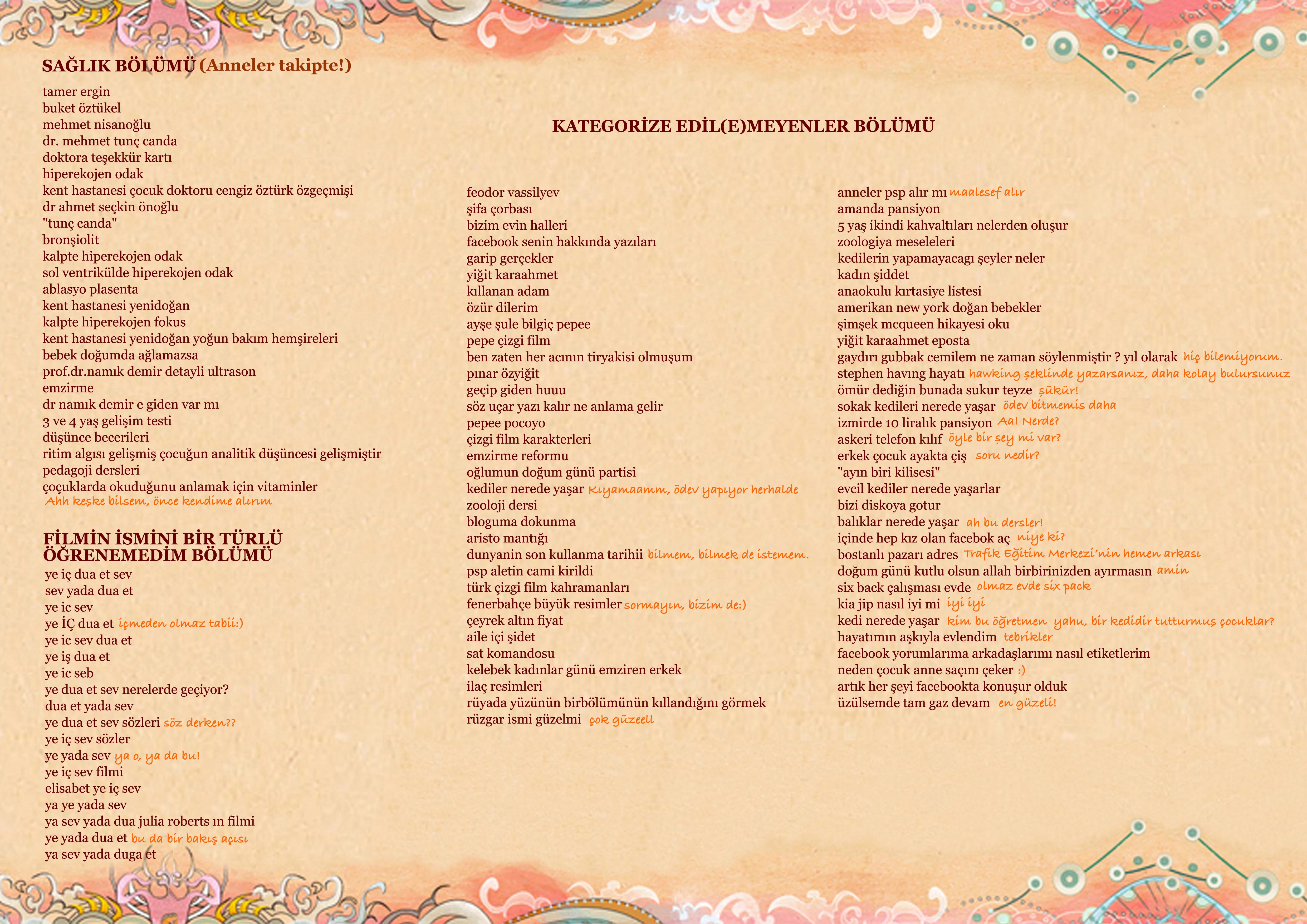 Blogların yönetim panelinde, ziyaretçilerinizin Google’dan hangi anahtar kelimelerle sitenize girdiğini görebiliyorsunuz. Birinci yılımı doldurmamın anısına bir göz atayım dedim. Neler gördüm, neler… Bir çoğunu elemek zorunda kaldığımı belirtmem lazım, inanılmaz şeyler vardı çünkü.