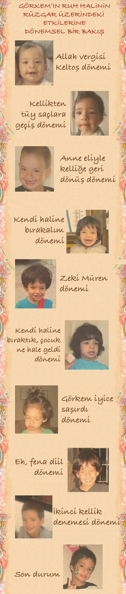 Bu arada, benim eskiden beri “bir gün oğlum olursa mutlaka saçlarını uzatacağım” gibi bir hayalim vardı. Sokaklarda gördüğüm, uzun saçlı, fırlama çocuklara bayılırdım. Gel gör ki, bizimkinin saçları pek bir zayıftı. O yüzden, birinci yaş gününün hemen ardından bir numara kazıttık. Nitekim güçlendi gerçekten, uzadı, gürleşti. Fakat ben hala karar verememiştim, tam olarak uzatsak mı yoksa yine kısa kestirsek, çocuk da rahat etse mi? Uzatmaya karar verdik kocamla… Amanın, zaman geçtikçe ortaya korkunç bir şey çıkmaya başladı. Yazık, kayınvalidem tam olarak şikayet edemiyor, kibarca “şu oğlanın saçlarını biraz düzelttirseniz” diyor ama dinleyen olmuyordu. Saçlar gözlere giriyor, kabarıyordu. Ben artık toplamaya falan başlamıştım. Bir gün, okulunun Facebook sayfasında aşağıdaki altıncı fotoğrafı görmemle, berber yolunu tutmamız bir oldu. Farkında olmadan oğlumu bir ucubeye çevirmişim de haberim yokmuş. Bu defa yine çok kısaltmamak kaydıyla kestirmeye karar verdik. Ardından bir yaz daha geldi, oğlan yüzme kursuna başladı, saçlar yine zırrrt iki numara oldu. Rüzgar bu arada durmadan boy atıyordu, kilo alması da yavaşlamıştı, o yüzden olsa gerek, kısacık saç eskisi gibi yakışmamıştı. Baba, ultimatomu çekti: “Bayramda berbere gidip saçlar düzelttirelecek, bu çocuk bensiz berbere götürülmeyecek ve saçlar bir daha asla kısa kestirilmeyecek.” “İyi” dedim. Arife günü, başlarına geleceklerden habersiz, baba-oğul çıktılar. Ben de kuaföre gittim. Eve döndüğümde,  olağanüstü bir durum olduğu belliydi. Yerlerde kıyafetler, ayakkabılar sağa-sola fırlatılarak çıkartılmış, banyo desen, sanki savaş meydanı… Rüzgar uyumuştu, şöyle bir baktım: Saçlar aynı şekilsizliğiyle duruyor. Olayın perde arkası şöyleymiş: