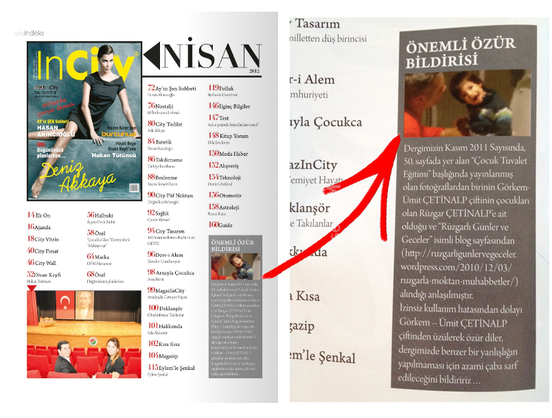 Rüzgar’ın tuvalet eğitimini anlattığım yazıda bulunan fotoğrafını iznimiz olmadan kullanan InCity dergisinin yeni sayısı elime geçti. Söz verdikleri gibi; uyarımız üzerine bir özür metni yayımlamışlar.